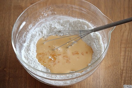 3.1の中央をくぼませて2を加え、粉がなじむまで混ぜる。