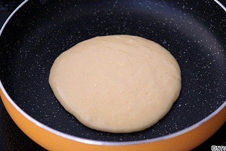 弱火にして再度火にかけ、お玉1杯ほどの生地を丸く流し入れて、弱火(2)で5~8分焼く(☆☆)。