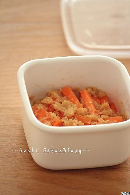 棒状に切ったにんじんと生姜味噌を ざっと混ぜて保存容器に入れておけばO.K.。