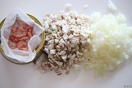 1.玉ねぎ・エリンギはみじん切りにする。カニ缶は漬け汁をよく切って身と分けておく。
