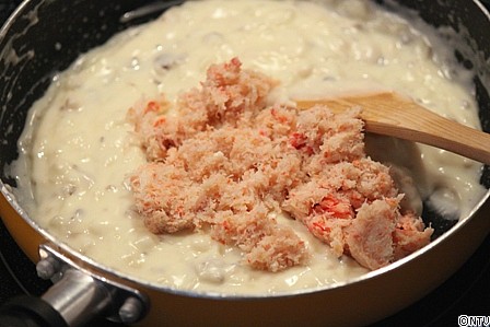 4.カニの身を加えて混ぜ、塩で味を整える。バットなどに広げて上からラップをして冷やす。