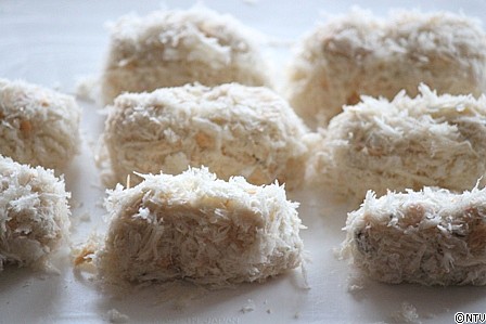 5.8等分にして俵型にし、Aにくぐらせてパン粉を付ける。