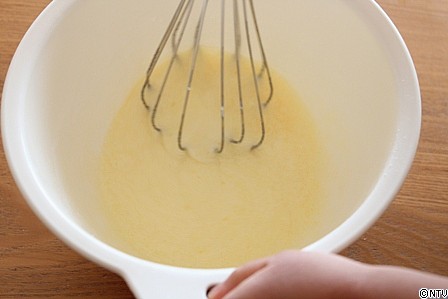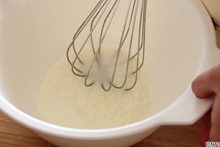 1.ボウルに卵白を入れ、泡立て器でコシを切るように混ぜる。