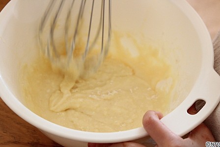2.生クリーム・溶かしバター(湯煎or電子レンジでも)を順に加え、その都度混ぜる。