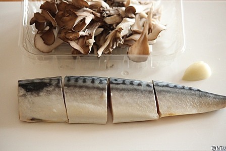 サバ 半身、マイタケ 1パック、ニンニク 1片、オリーブオイル 大さじ1、