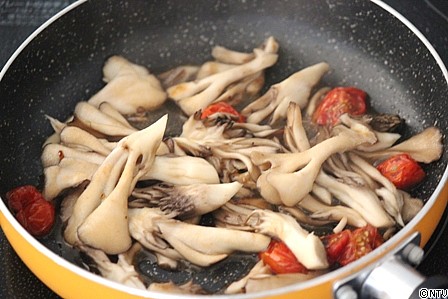 生のミニトマトを使う時はマイタケと一緒にミニトマトをしっかり炒めるといいですよ。