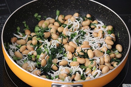 2.フライパンに油を熱し、大豆と小松菜を炒める。