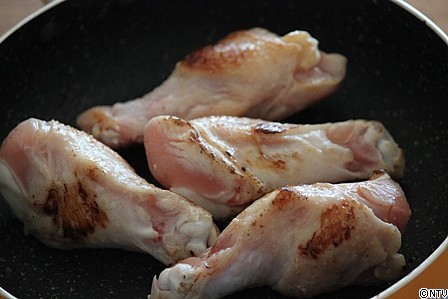 鶏手羽元を加えて表面に焼き色を付けるように焼く。