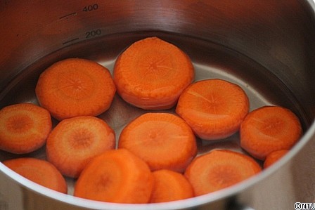2.鍋ににんじんを入れ、ひたひたくらいの水を加えて火にかける。