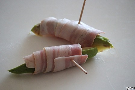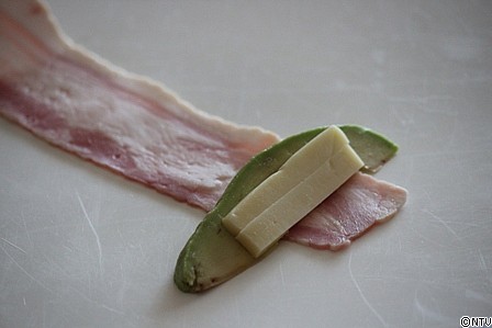 2.ベーコンにアボカドとチーズをのせて巻く。巻き終わりを爪楊枝で留める。
