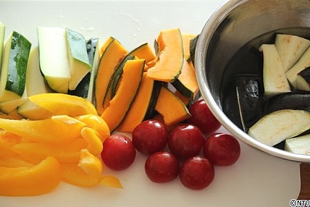 茄子 1本、ズッキーニ(小さめ) 1本、パプリカ(黄) 1/2個、かぼちゃ 1/8個、ミニトマト 8個