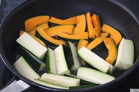 2.フライパンに油を熱し、ズッキーニとかぼちゃを焼く。