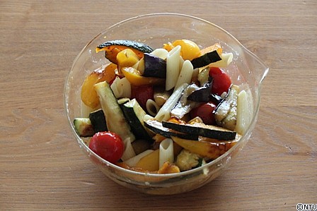 焼き野菜とペンネのマリネサラダ、さっぱりととっても美味しそうです。