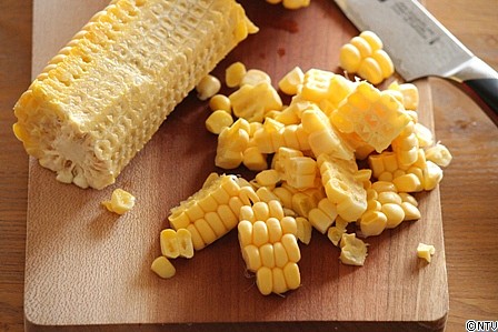 1.とうもろこしは縦に包丁を入れて実を削ぐ。