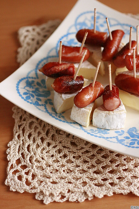 焼いたウインナーとチーズを爪楊枝に刺して飾る。