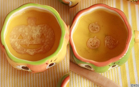 スープに浮かんだ小さなカボチャ型のその中の目や口の切り抜きは大変でしょう。