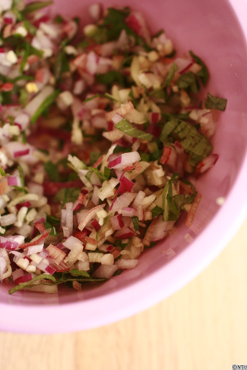 これらをみじん切りにして、ゆで卵と合わせます。
