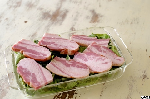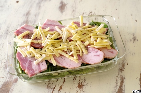 ⒉ベーコンを並べてチーズをかける(こちらは厚切りベーコンを使用ですが薄切りでも十分美味しいです)
