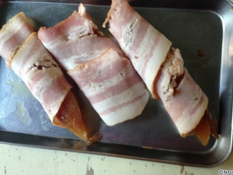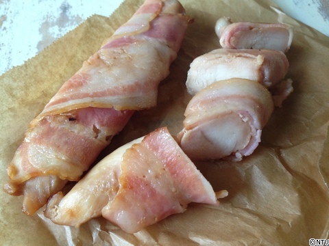 ⒊⒉にベーコンを巻きつける(ささみは1本に1枚、胸肉は1枚に3枚)