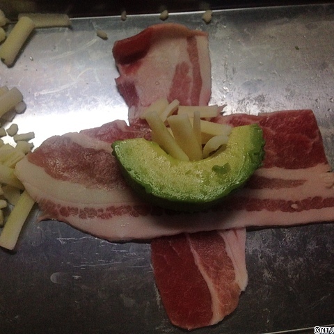 ⒊豚バラ肉を十字において真ん中にアボカド&チーズをおきます。