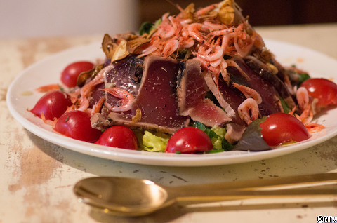 厚く切ったカツオのたたきに塩をふって薬味たくさんでいただきます。