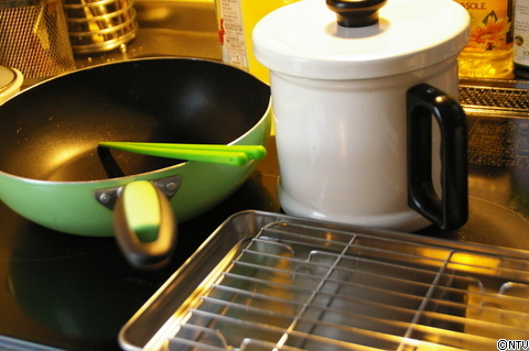 使い古しの深型フライパンとバット&網。菜箸さえあれば準備完了です^^