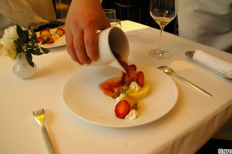 冷たいパルフェに温かい苺のソースをシェフがかけてくださいます♡