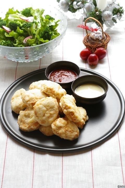 6. 揚げたナゲットを器に盛り付け、ソースを添えて完成です。