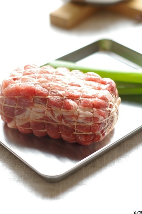 1. 豚肩ロース肉をたこ糸を巻いて形を整えフォークを使って