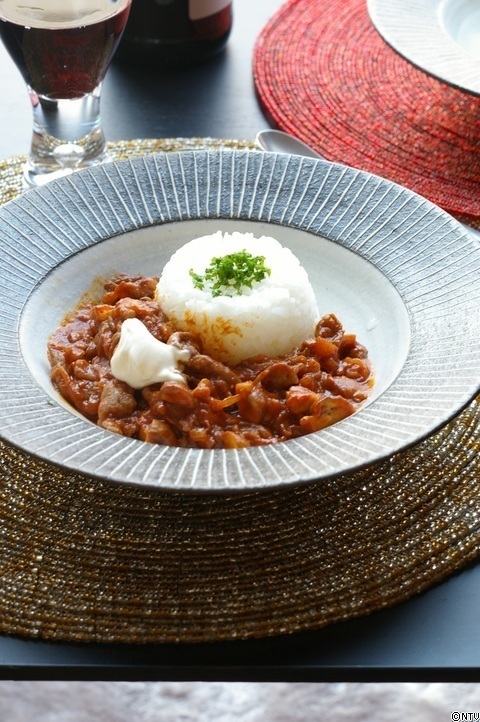 5. 皿にご飯をよそい、ビーフストロガノフを盛りつけ、