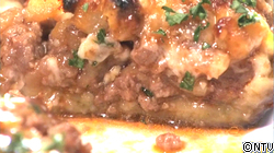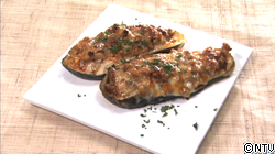なすの皮に(3)を詰め、上にチーズをのせます。耐熱容器に入れ、オーブントースターで焼き色がつくまで焼きます。仕上げにパセリのみじん切りを散らします。