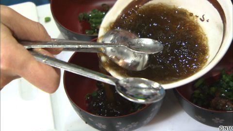 ② 盛り付ける前に鶏皮を取り出して細切りにし、カップに戻す。