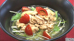 炊きあがった(1)の麦ご飯をボウルに移し(4)を加えて混ぜ合わせ、丼に盛ります。ざく切りにした水菜、(5)をのせます。(6)のスープをかけ、4等分にしたプチトマトを散らしたら出来上がりです。