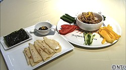 チュンピンにみそをぬり、豚肉や野菜などを包んで頂きます。