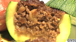 新玉ねぎをみじん切りにし、ズッキーニの中身は細かく刻んで水分を絞ります。オリーブオイルをひいたフライパンで水分が無くなるまで炒め、塩、こしょう、ナツメグ、赤味噌で味を調えます。