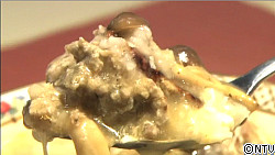 鍋に白がゆ、水を入れて煮立て〈C〉を加えて味付けをします。残りの卵白を加えて火を止めます。