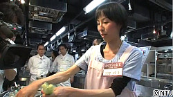 一次予選ステージCを第4位で通過した河埜さん。河埜さんといえば、そうリベンジ組のお一人。前大会では「工夫が足りないかな…」と脇屋シェフに言われ、レシピ審査にて敗退してしまいましたが、その悔しさをバネに今大会一次予選ではその脇屋シェフの舌をうならせ見事名誉挽回となりました!そんな河埜さんが今回挑戦したレシピは…市販品を上手に利用して作るスープ餃子。餃子の中身にはごま豆腐、塩昆布、ねぎを混ぜ合わせたものとロース肉を入れました。またスープには賽の目に切った卵豆腐を加えだしに旨味をプラスしました。スープで加熱した餃子はごまダレのようにトロっとし、そのアイディア、味に審査員の先生方も「おいしい!」と高評価!さらに薬味サラダ、そしてごぼうソースを加えることで食感や味に変化もあり、「計算させた料理、味のバランスがよい!」との評価もありました。見事二次予選突破、最終予選進出です!おめでとうございます!!