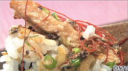 炊き上がったご飯に刻んだザーサイときくらげ、白ごまを混ぜ合わせて器に盛ります。その上に汁気を切った(5)、さらに一口大に切った(3)をのせ、糸唐辛子、小口切りにした浅葱を散らしたら出来上がりです。