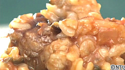 (5)の加熱が終わったら火を止め、水で鍋を冷やし急冷させて圧を抜きます。これをフライパンに移し替え、ご飯、しょう油を加え、水分を飛ばしながらリゾット状になるまで煮ます。