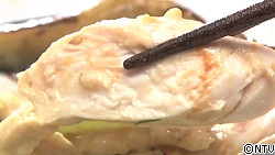(1)に筋をとったささみを加え、軽く再沸騰してきたら蓋をし火を止めます。5分程おき、ささみを取り出しラップをして冷ましておきます。