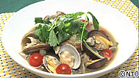 (4)に水を入れ煮立て、あさりの口が開いてきたら〈A〉を加え味を調えます。