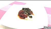 (8)を器に盛り付けます。そこに(5)の長芋ソースをかけ、炒めた野沢菜をのせたら出来上がりです。