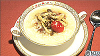 鍋に白がゆ、水を入れて煮立て〈C〉を加えて味付けをします。残りの卵白を加えて火を止めます。