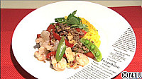 「海老とスナップエンドウのエスニック炒め ターメリックライス添え」