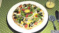 焼きあがったWA! PIZZA!に(3)のわかめ、イタリアンパセリをトッピングし、輪の中央にサラダを盛り付けたら出来上がりです。