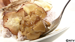鍋にオリーブオイルを入れて火にかけ、野菜、りんごのスライスを揚げます。