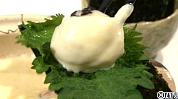 白玉を溶かしたチーズにからめ、のり、大葉に巻いて頂きます。