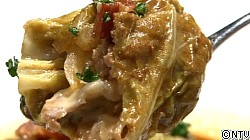 (1)のキャベツの芯の固い部分を削ぎ落とします。葉を拡げたら中央に(2)の豚肉(4枚ずつ)をのせ、軽く塩こしょう、ナツメグを振ります。