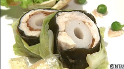 福岡出身の井上さん、博多で有名な「水たき」をヒントに考えたレシピで挑戦してくれました。短時間にも関わらずとってもキレイな仕上がり。食パンを使って食べられる器を作ったり、余ったオブラートを料理に活用したり…更には茹でた野菜を新聞紙で保温したりと色々な料理テクニックを見せてくれました!淡白と思われがちな鶏のむね肉ですが、しっかりとした味のものを加えることでさっぱりとした中にも旨味とコクのある一品となりました!