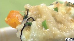 沢山の応援団と共に挑んでくれた板東さん。長芋をすりおろし、また千切り、みじん切りにして、3通りの食感が楽しめる長芋グラタンを作ってくれました。子供からお年寄りまで楽しめるこのグラタン、本当に簡単に作れるので忙しい主婦の方にもピッタリですね!味に飽きたらわさび、ごま油を少し混ぜて頂くとまた違った味も楽しめるそうですよ。